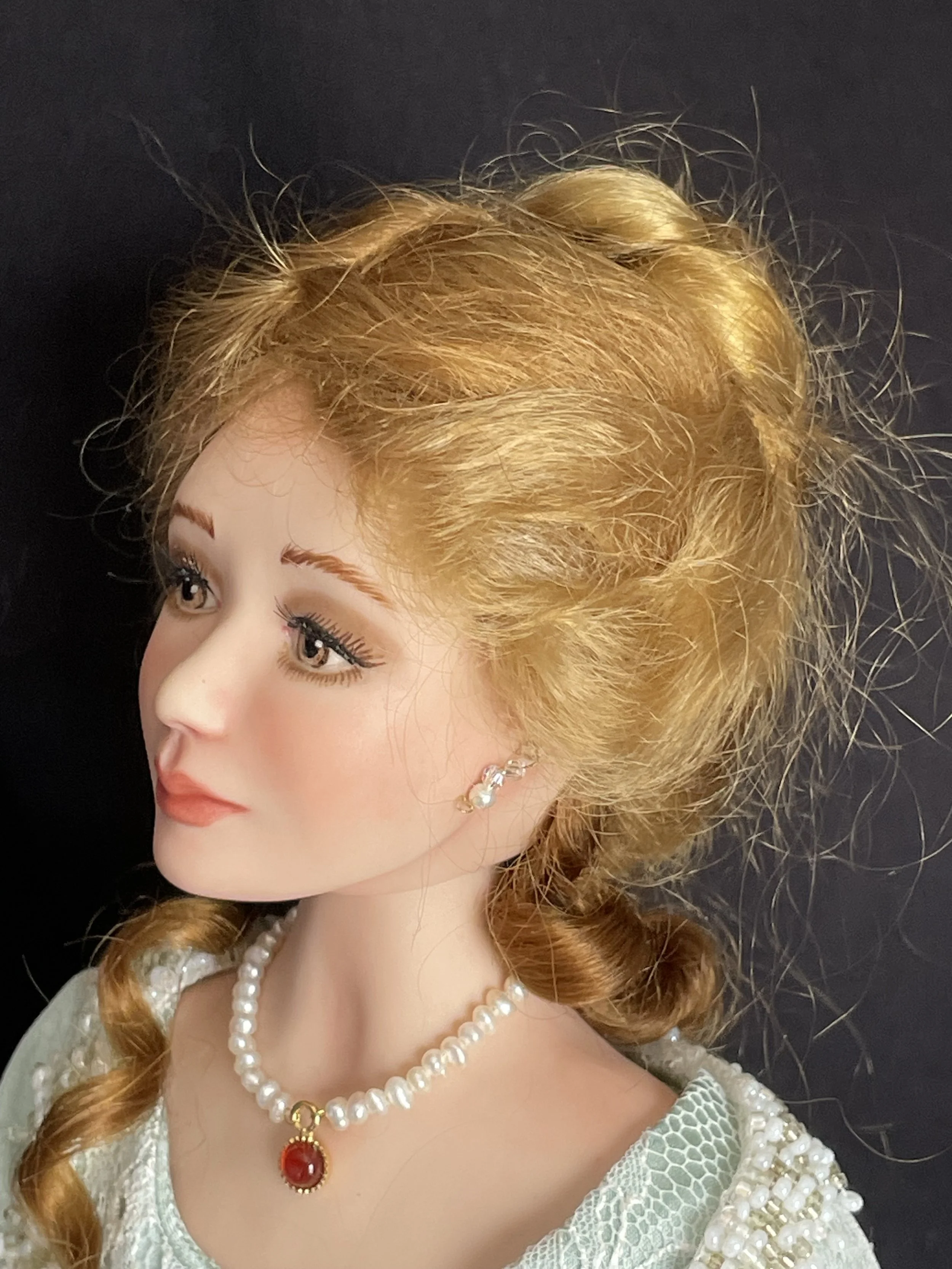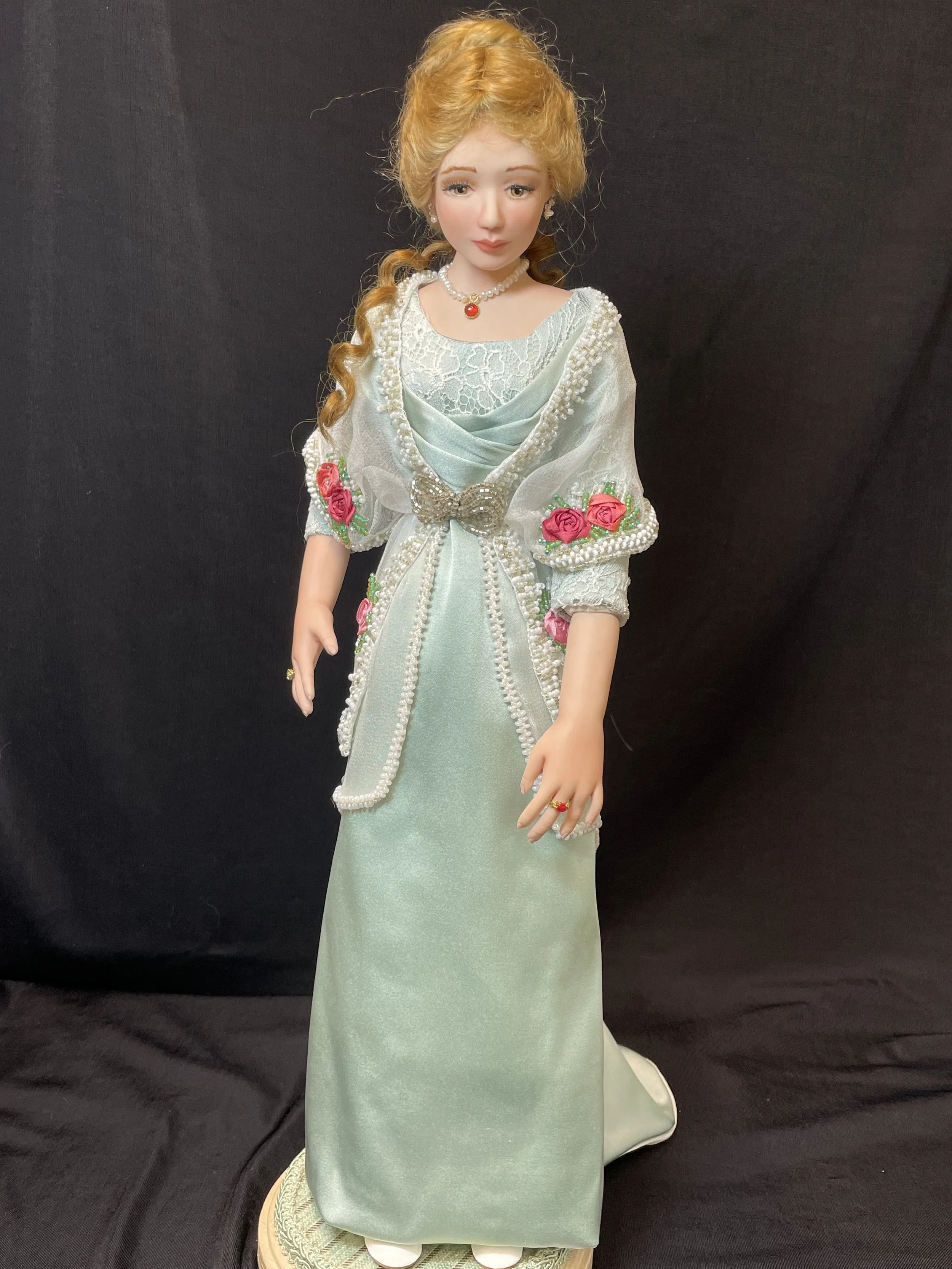 In the early 1900's the designer Paul Poiret began showing gowns designed with a softer silhouette which eliminated the need for a corset. This doll's costume was inspired by an evening gown from Paul Poiret in 1910-11. It is silk with lace and a silk organza overdress with beading and silk ribbon embroidery. 16 inches, painted eyes and mohair wig.