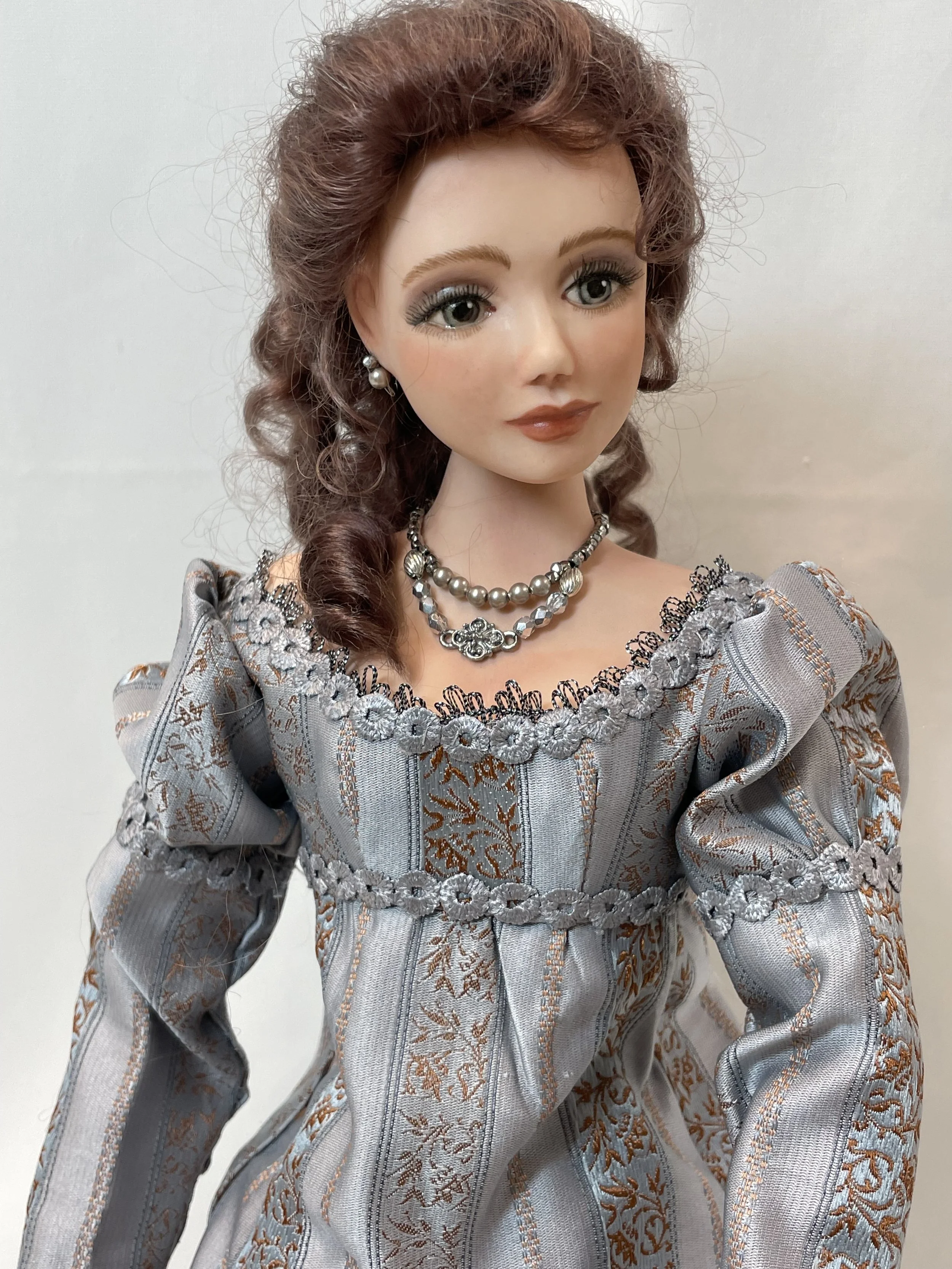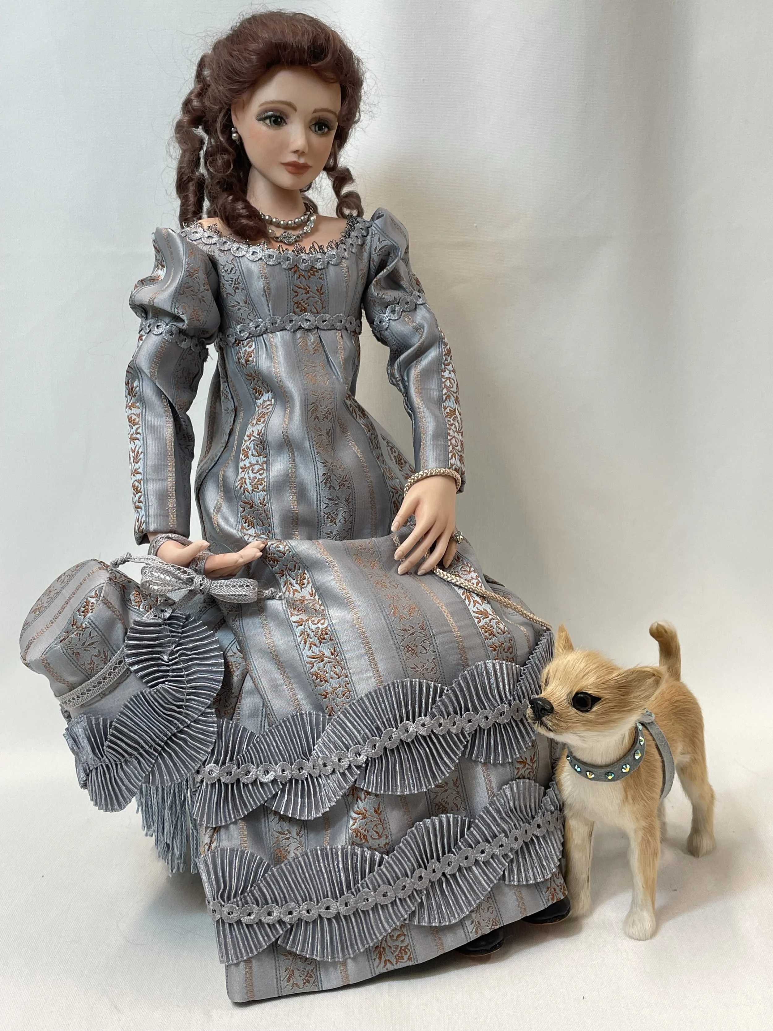 This fashionable lady of the early 1880's is seated on an upholstered stool getting ready to take her dog for a walk. She wears a high waisted silk gown and is holding her matching bonnet. If standing she would be 16 inches. Painted eyes, mohair wig.